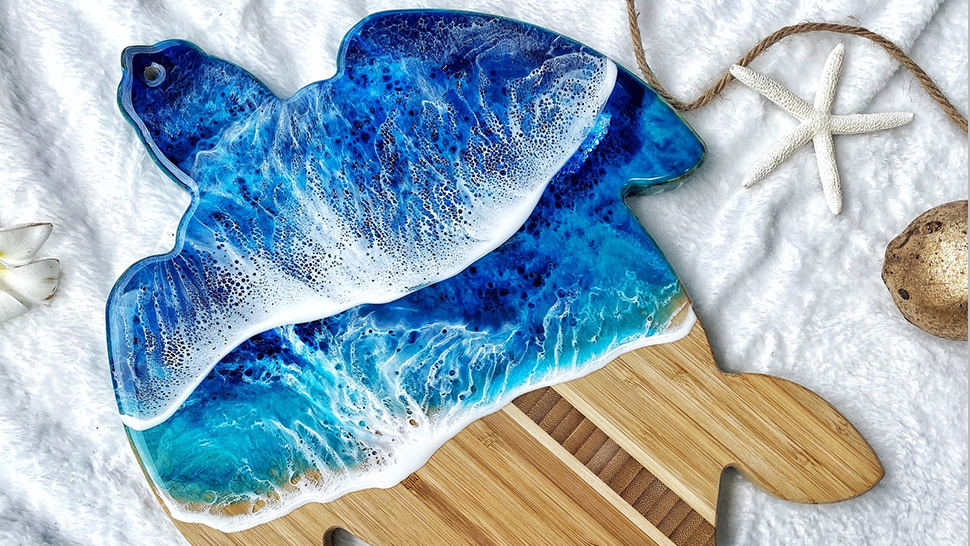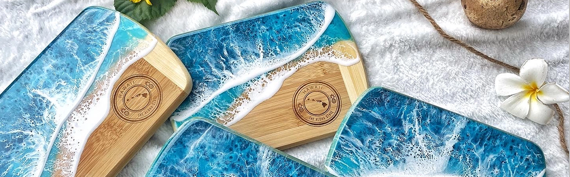 Our ocean serving dish “‘Āina” is made from Hawaiian Monkeypod wood with a captured ocean scene, and is perfect for any type of snacks or spreads, as a trinket dish, or as a Hawaii souvenir – handcrafted right here in our small shop on Maui! This resin ocean dish is the perfect addition to your collection of serving trays & dishes for your next get together and will surely bring you much-needed ocean vibes! These also work beautifully for any beach-themed wedding to add some color to your table and buffet setting.